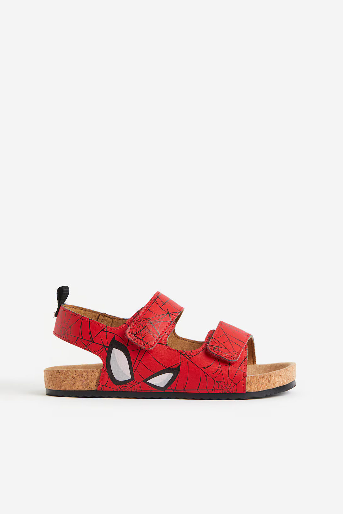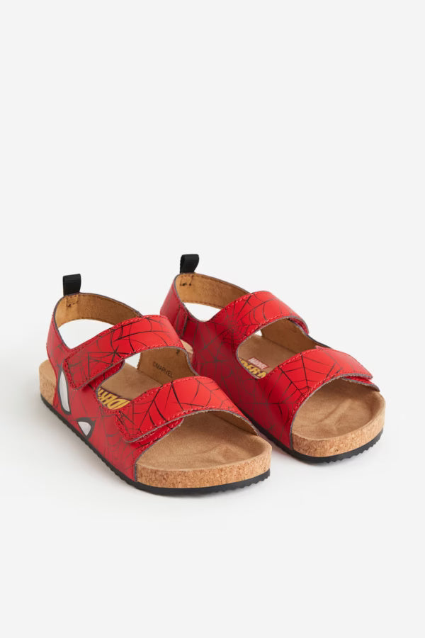 Sandals with adjustable hook and loop tabs at the top and a loop at the back. Moulded insoles and patterned soles.
