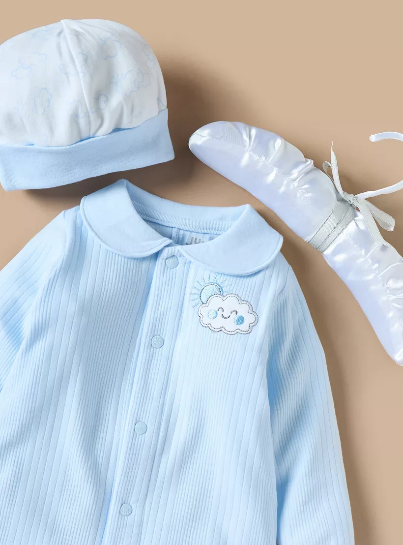 This five-piece set includes a charming embroidered sleepsuit, a matching cap, a pair of booties, and a blanket. The soft, ribbed fabric of the sleepsuit ensures comfort, while the full button closure allows for easy changing. The coordinating set is perfect for newborns and gifting. This practical and stylish set offers both comfort and convenience for your little