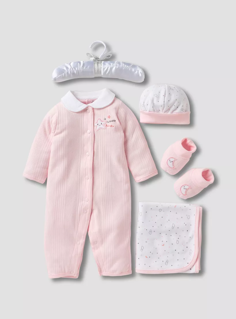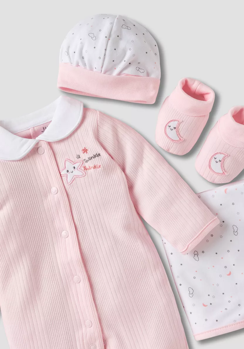 This five-piece set includes a charming embroidered sleepsuit, a matching cap, a pair of booties, and a blanket. The soft, ribbed fabric of the sleepsuit ensures comfort, while the full button closure allows for easy changing. The coordinating set is perfect for newborns and gifting. This practical and stylish set offers both comfort and convenience for your little