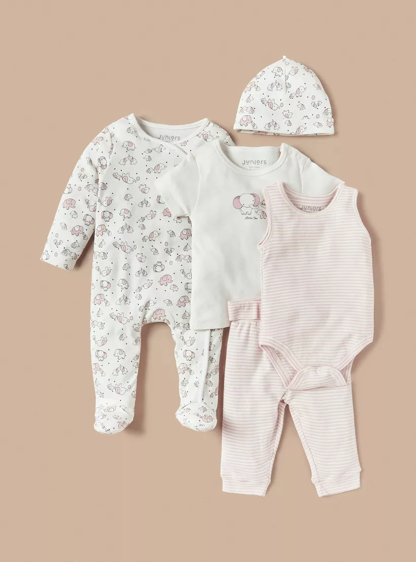 Pamper your little bundle of joy with this cute six-piece set. Designed with the utmost care, it includes a closed-feet sleepsuit, a T-shirt, a pair of pyjamas, a bodysuit, a beanie, and a carry bag, providing all the essentials for a comfortable and stylish start to their day. This set is enhanced by a soothing colour and crafted from cosy cotton material.