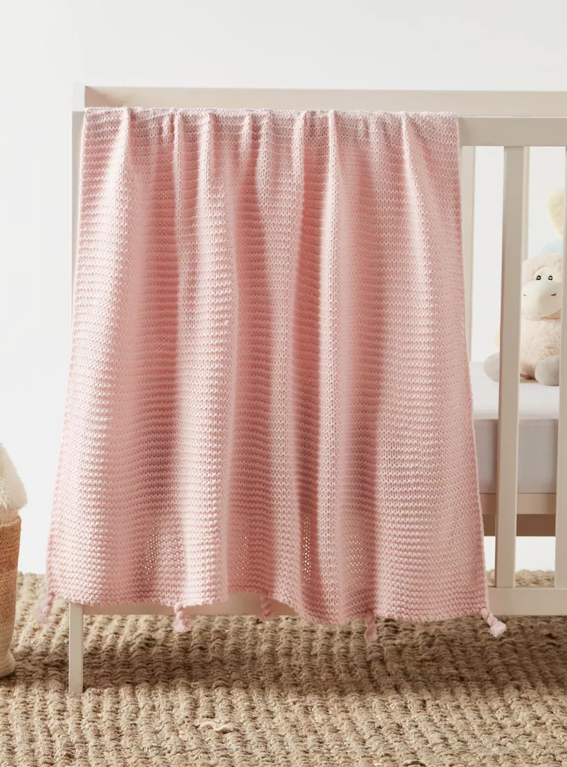 Ensure your just-born feels warm and cosy with bedding essentials like this blanket. The blanket has a textured surface that makes it a cute pick. The tassels look appealing.